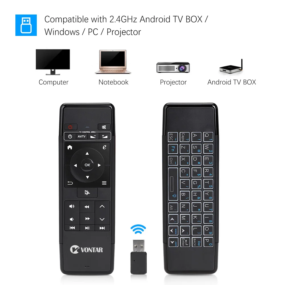 . Vente VONTAR 2.4 ghz Air Souris Clavier Sans Fil à 6 Axes D apprentissage IR Télécommande avec Rétro Éclairé rechargeable pour Android TV BOITIER PC Pas Cher Prix.