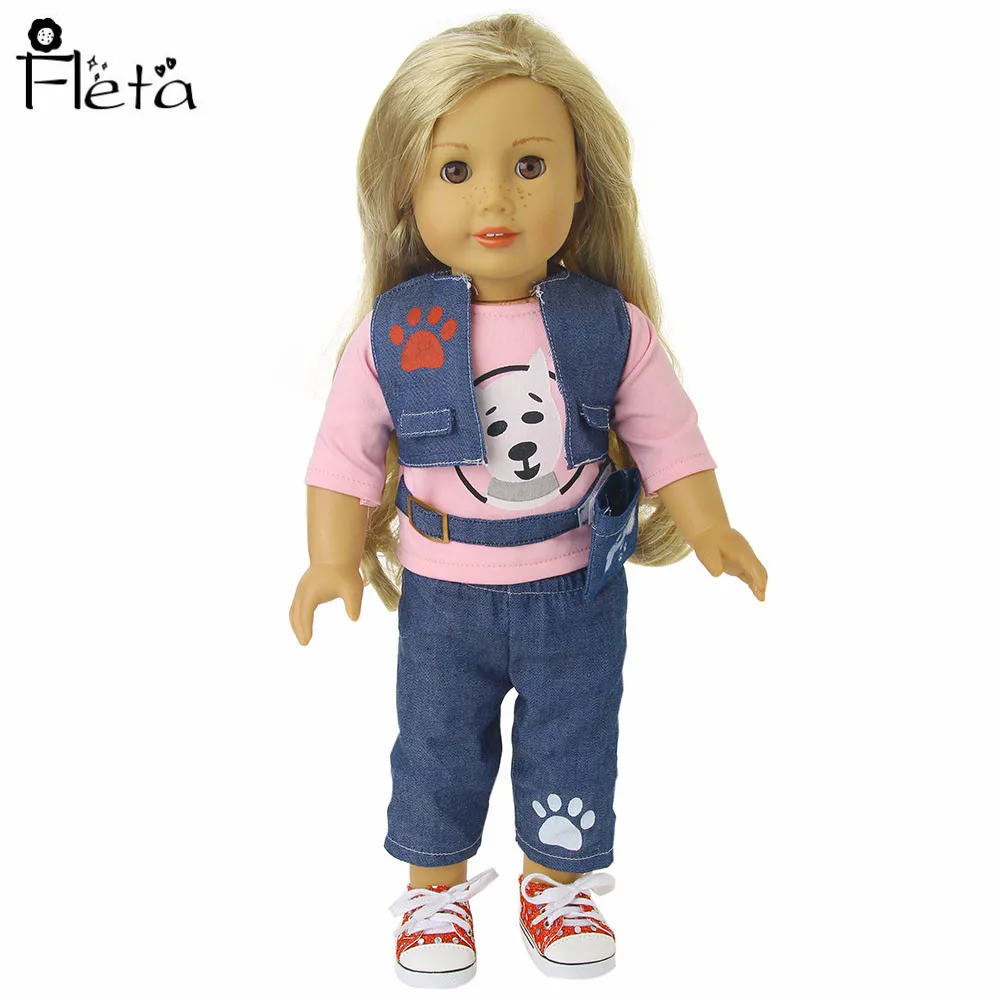 . Acheter Fleta poupée Nouveau Dessin Animé Poupée Ensemble 3 pièce Ensemble Denim Gilet + Rose de Bande Dessinée Shirt + Jeans pour 18 pouces Américain Poupée (Aucun Jouet Chien) Pas Cher En Ligne.
