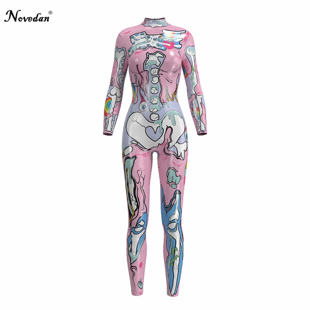 Achat 2018 Nouveau Femmes Sexy Combinaisons Halloween Costumes Pour Femmes 3D Crâne Rose Impression Combinaisons Effrayant Squelette Macacao Feminino Pas Cher En Ligne
