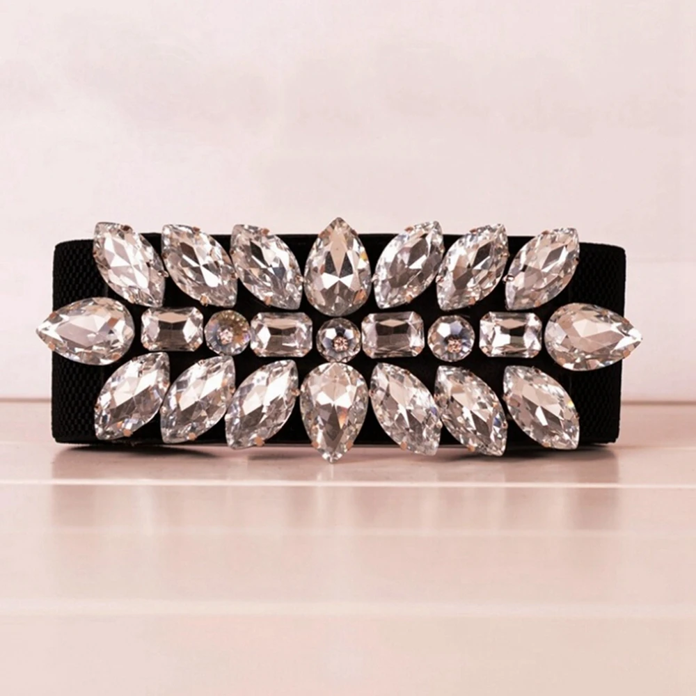 Achat Meilleur Magnifique Cristal Stretch Taille Ceinture pour Femmes Large Élastique Ceinture Sangle Noir Blanc Cummerbunds Corset Cinch Pas Cher En Ligne.